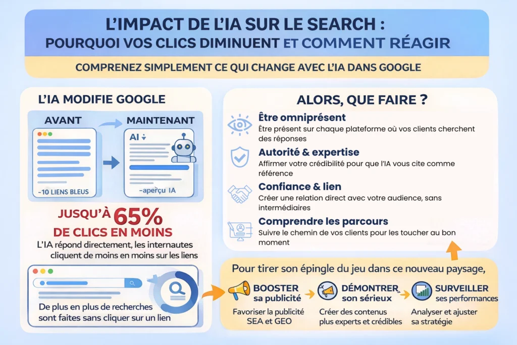 Conséquence directe : votre site, même parfaitement référencé, peut devenir invisible si le moteur répond à la question de l’utilisateur sans renvoyer vers vous.